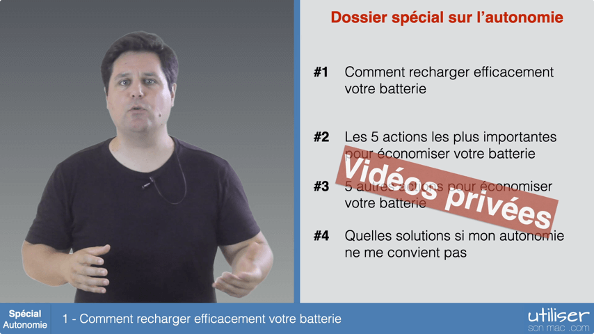Comment recharger efficacement votre batterie Vous trouvez que votre iPhone, votre iPad ou votre Mac n'a pas une autonomie assez bonne ? Peut-être que vous pouvez améliorer certaines choses sans même faire changer la batterie interne ou racheter un appareil. Je vous propose de découvrir comment dans ce dossier spécial consacré exclusivement à l'autonomie de vos appareils Apple. Ce dossier comprends 4 vidéos :